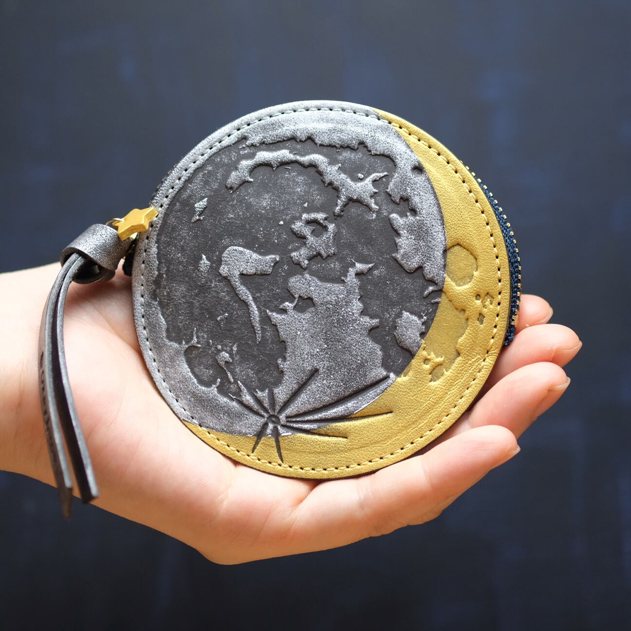 姫路レザーに月の地形の刻印を施して凹凸感が楽しい革のお月様を作り、コインケースに仕立てました。