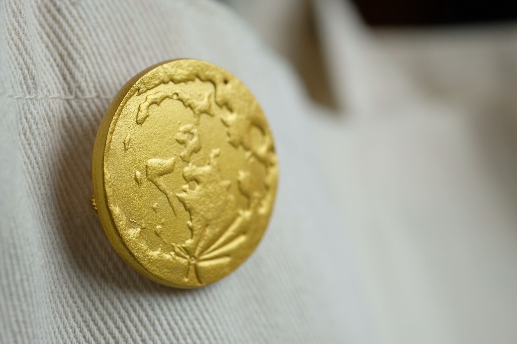 直径4㎝の革に月面型の刻印を押して月を作り、ブローチに仕上げました。